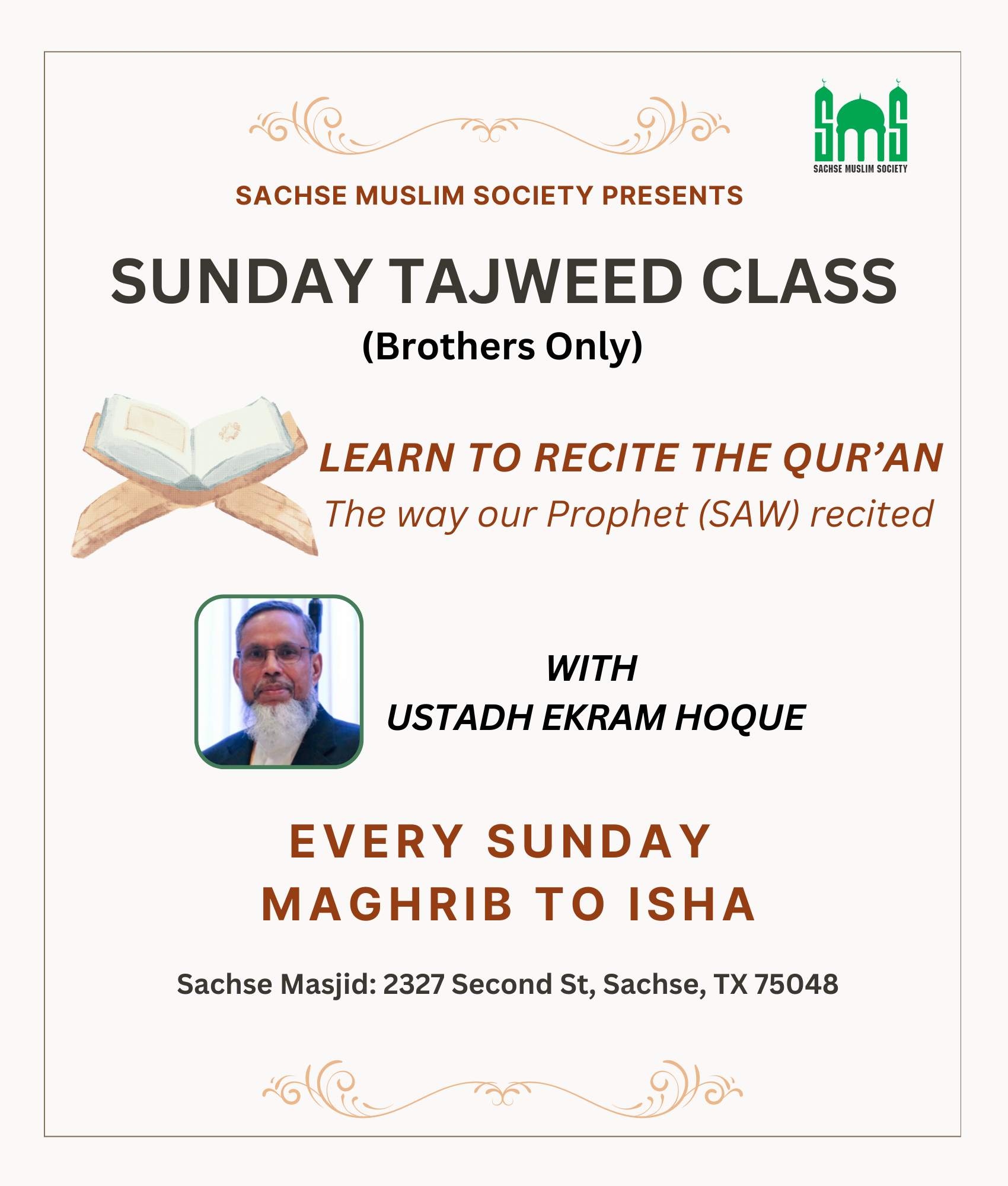 Read Quran with ease and beauty by following its rules and enhancing the Tilawah (recitation) skills. This session is for brothers, only, where we learn the set of rules for correct pronunciation of the Arabic letters with all their qualities and applying various traditional methods of recitation.